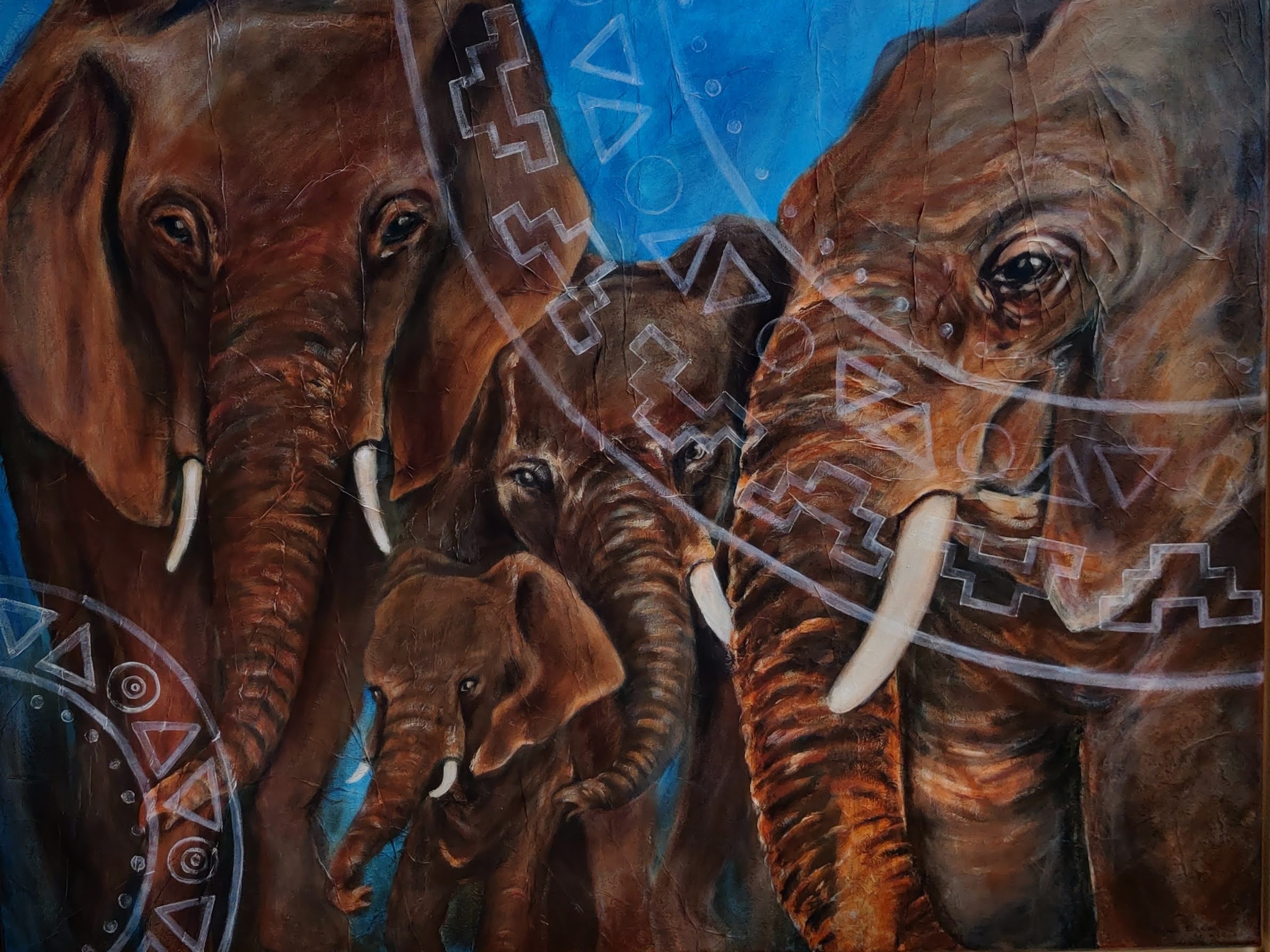 The elephant serves as a central symbol of belonging and heritage in the artist’s work. Influenced by a nomadic childhood in South Africa, she perceives “home” as a state of interpersonal connection rather than a fixed place. Painting these subjects marks a return to her roots, offering a source of profound inner peace and creative strength.
